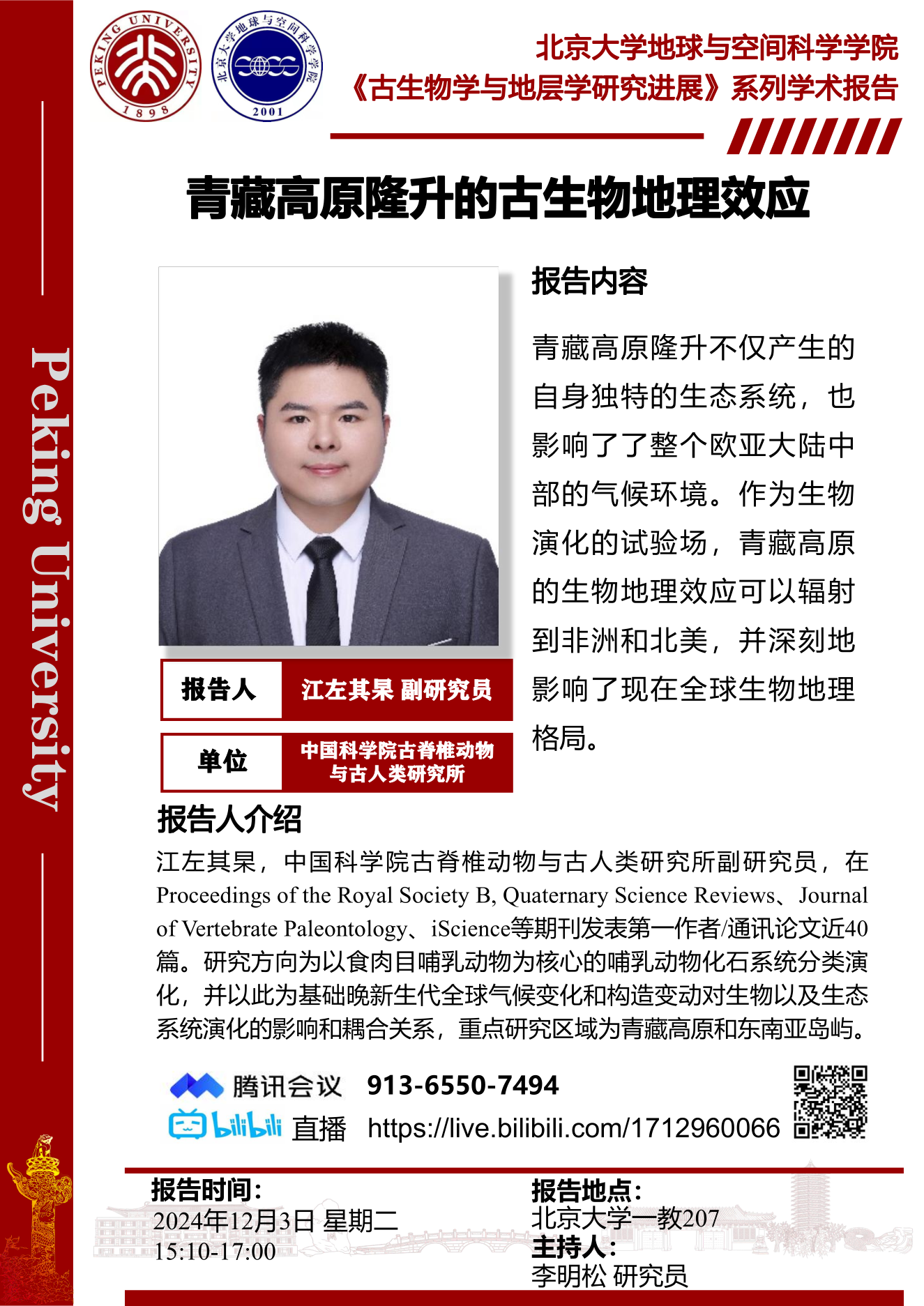 报告人介绍:江左其杲,中国科学院古脊椎动物与古人类研究所副研究员,在Proceedings of the Royal Society B, Quaternary Science Reviews、Journal of Vertebrate Paleontology、iScience等期刊发表第一作者/通讯论文近40篇。研究方向为以食肉目哺乳动物为核心的哺乳动物化石系统分类演化,并以此为基础晚新生代全球气候变化和构造变动对生物以及生态系统演化的影响和耦合关系,重点研究区域为青藏高原和东南亚岛屿。