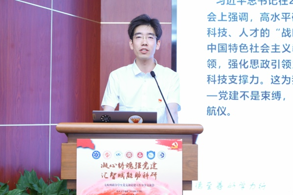 北京大学地球与空间科学学院地球物理研究生党支部袁源以《追光不辍强国梦,党旗引领谱华章》为主题,分享了党支部以李四光精神为引领,聚焦“课程思政、科普宣讲、科研攻关、校地合作”开展的一系列党建工作。