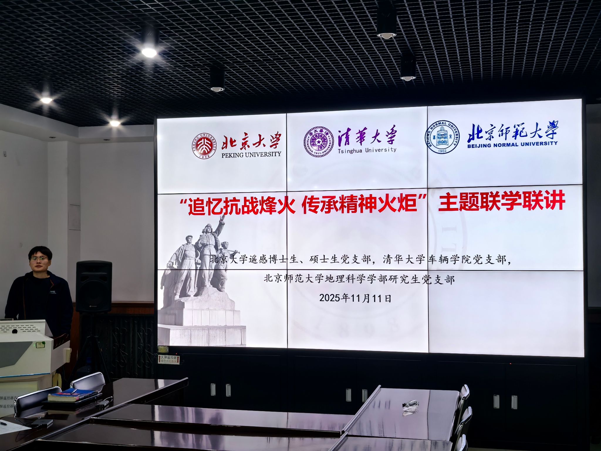 今年是中国人民抗日战争暨世界反法西斯战争胜利80周年。为深入学习习近平总书记在纪念中国人民抗日战争暨世界反法西斯战争胜利80周年大会上的重要讲话精神,11月11日晚,北京大学地球与空间科学学院遥感博士生党支部联合遥感硕士生党支部、清华大学车辆与运载学院车辆博22、博21、硕23、博5党支部以及北京师范大学地理科学学部第十一、十七、十八党支部,开展了“追忆抗战烽火,传承精神火炬”主题联学联讲活动。