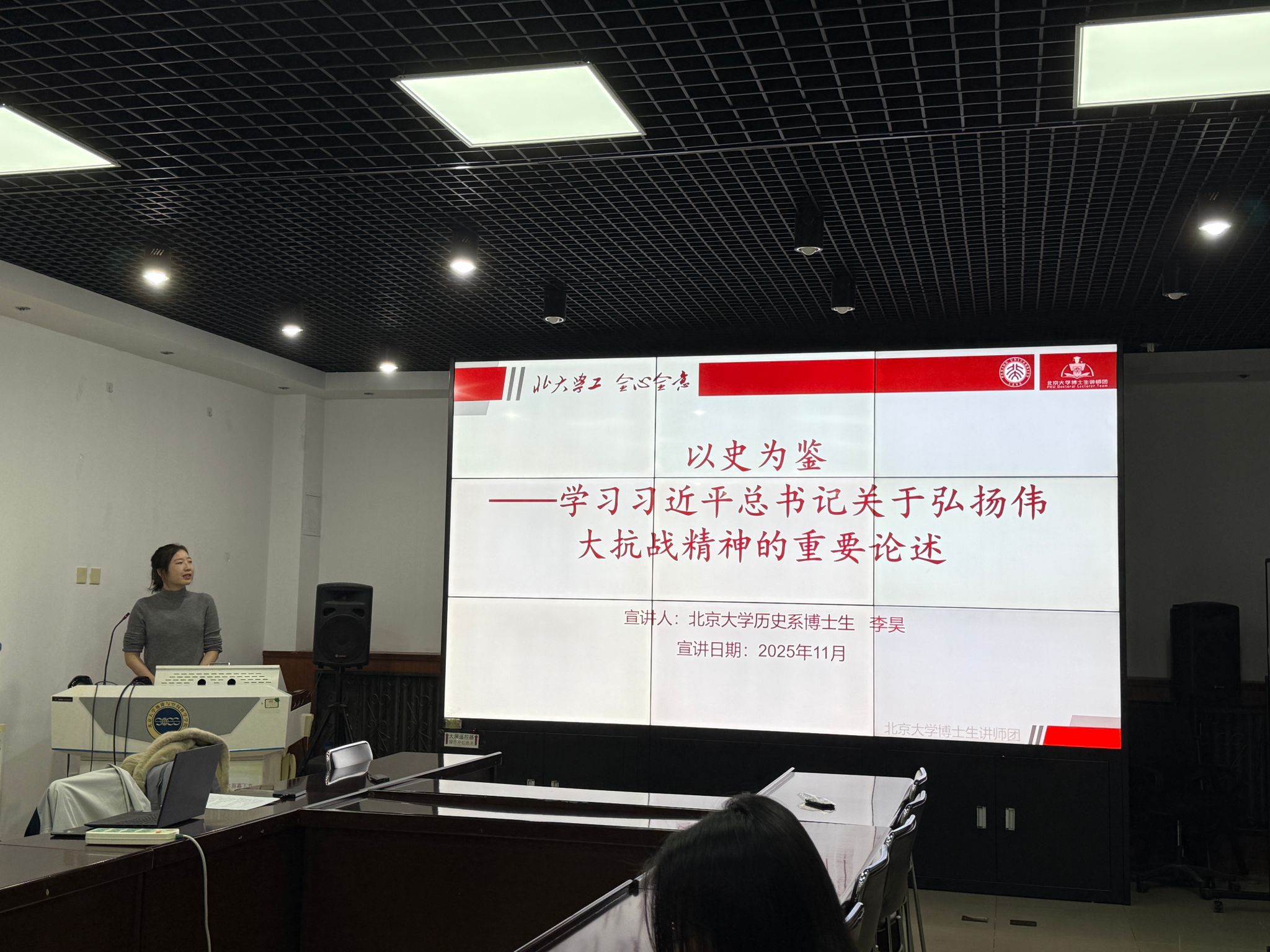 北京大学博士生讲师团讲师李昊同志以“以史为鉴:学习习近平总书记关于弘扬伟大抗战精神的重要论述”为题作宣讲。她从“八年抗战”到“十四年抗战”的叙述演变切入,系统梳理了话语转换背后的国家立场与历史学理,号召青年党员把伟大抗战精神中的“爱国情怀、民族气节、英雄气概、必胜信念”转化为坚定的历史自信与实践担当,在强国建设、民族复兴的征程上勇毅前行、实干笃行。
