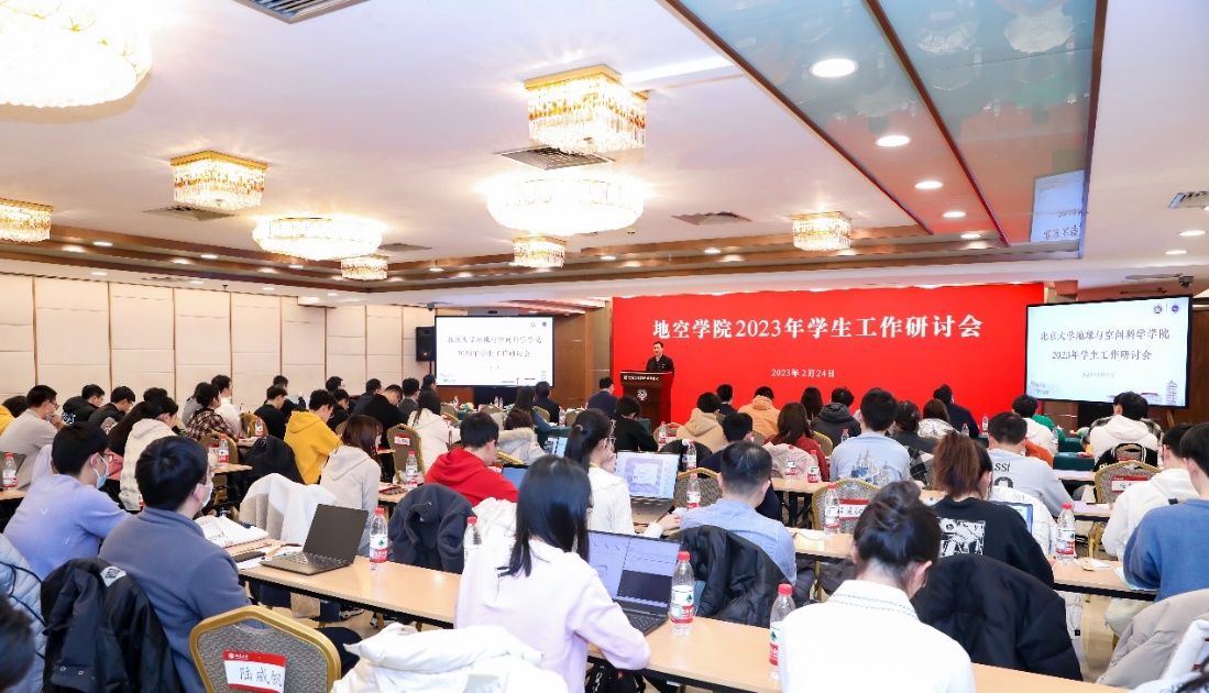 2月24日下午,地球与空间科学学院2023年学生工作研讨会在英杰交流中心月光厅召开。北京大学学生工作部部长王逸鸣,学生心理健康教育与咨询中心主任刘卉,青年研究中心主任王艳超,学生资助中心副主任石运佳,学生就业指导服务中心副主任李晓瑭,学生心理健康教育与咨询中心陶元君老师,以及地空学院党委书记李培军,副院长宁杰远、刘瑜、何建森,党委副书记江大勇、陈云超等参加研讨会。地空学院班主任、辅导员代表、学生骨干代表等80多人参会。会议由陈云超主持。