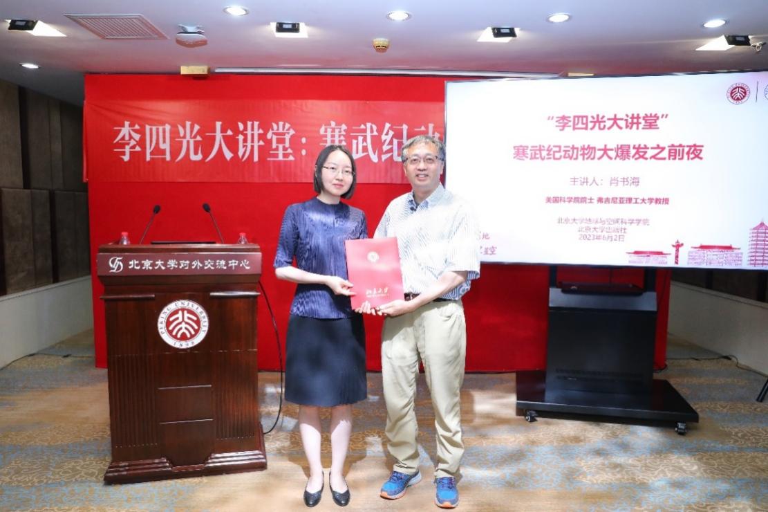 6月2日下午,“李四光大讲堂”第二讲在北京大学英杰交流中心举行。美国国家科学院院士、美国弗吉尼亚理工大学教授、北京大学地质学系1984级系友肖书海应邀以“寒武纪动物大爆发之前夜”为主题作学术讲座。会议由北京大学地球与空间科学学院、北京大学出版社联合举办。