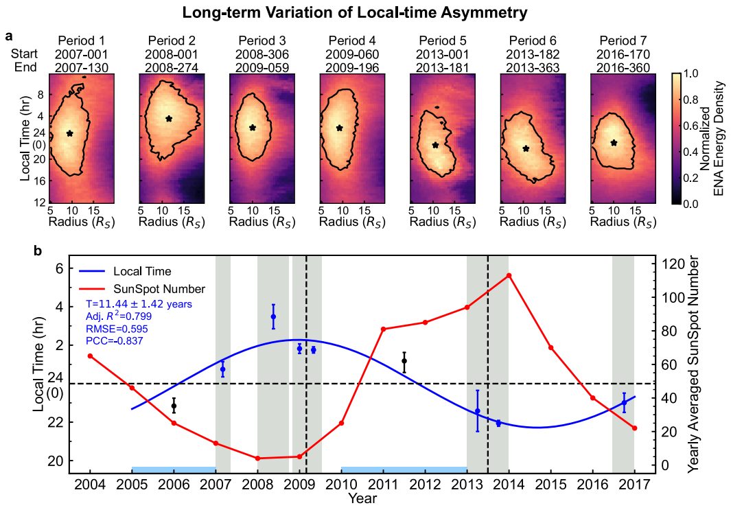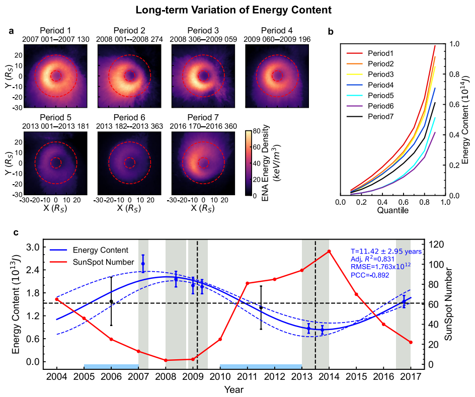 北京大学空间物理与应用技术研究所乐超研究员课题组利用土星探测卫星卡西尼号(Cassini)上搭载的能量中性原子成像仪研究了土星环电流的长期分布特征,发现由超热等离子体(~24-230 keV)贡献的环电流成分在空间分布和强度上存在近11年的长周期变化,并将这种变化与太阳活动周期相关联,提出太阳活动周期调制土星磁层中等离子体加速与输运过程的可能性。相关成果于近期发表于学术期刊《自然·通讯》(Nature Communications)。