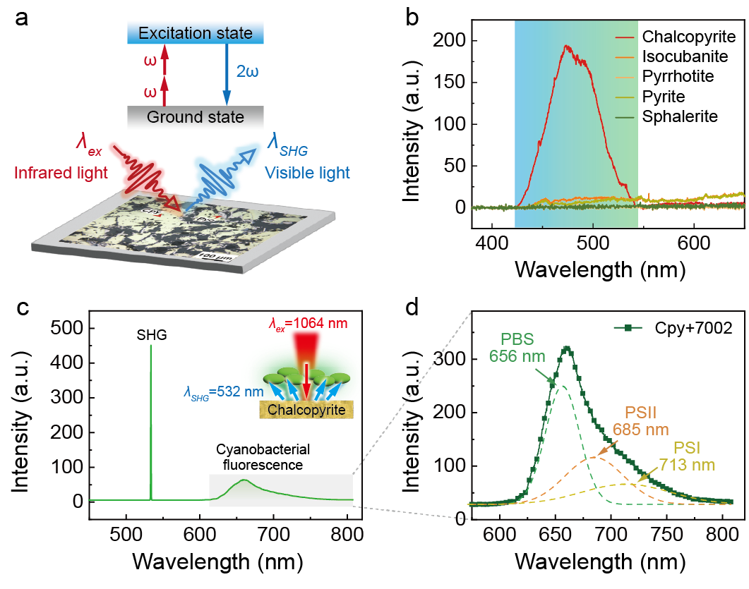 (a) 深海热液硫化物矿物SHG示意图;(b) 800-1500 nm激发下硫化物矿物的发射光谱;(c) 黄铜矿SHG激发蓝细菌Synechococcus sp. PCC 7002的荧光响应光谱,插图为红外光激发实验示意;(d) 蓝细菌荧光信号分峰拟合结果。