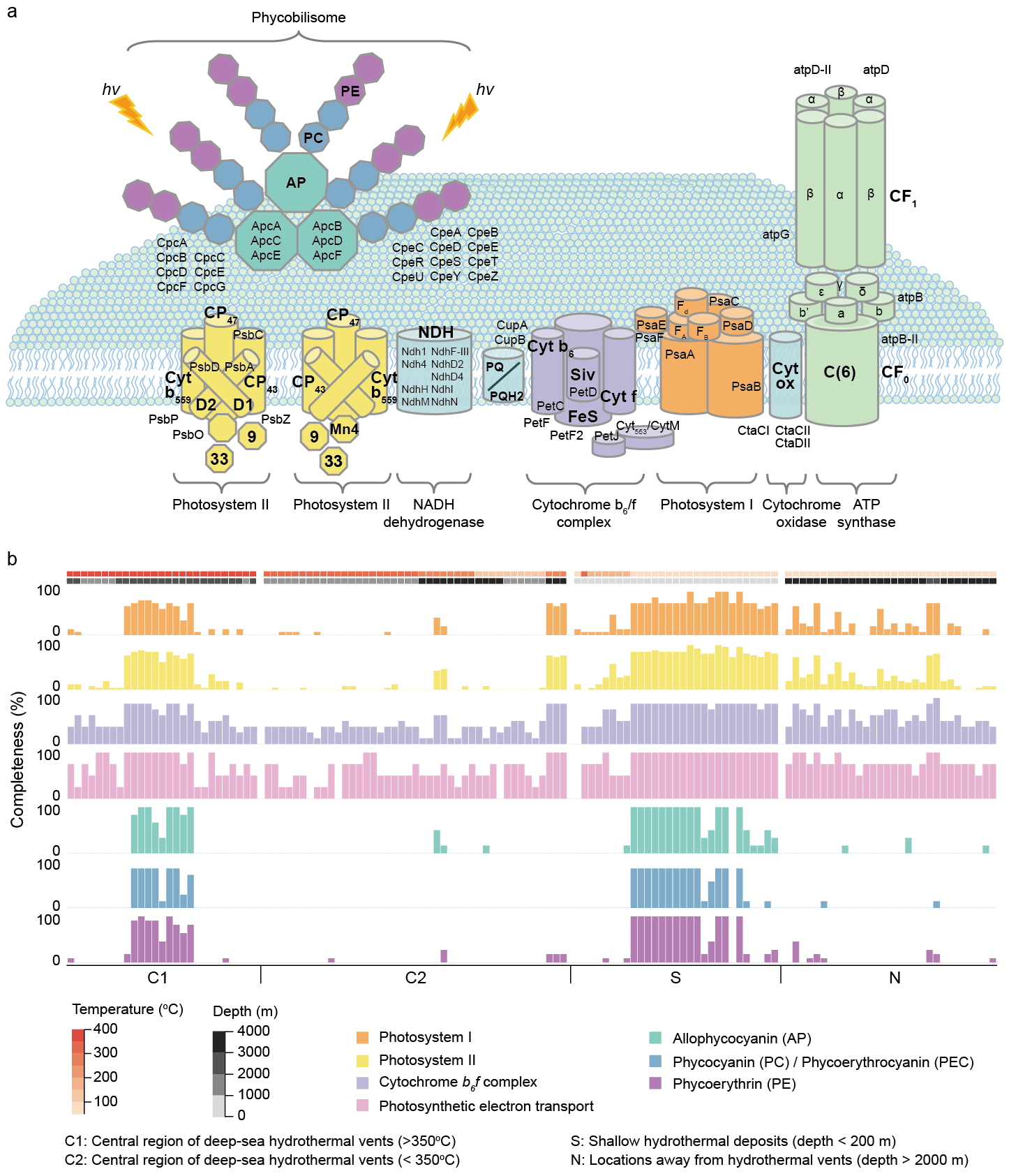 (a) 光合系统相关的功能基因示意图;(b) 四种海洋环境中光合功能基因的完整度。